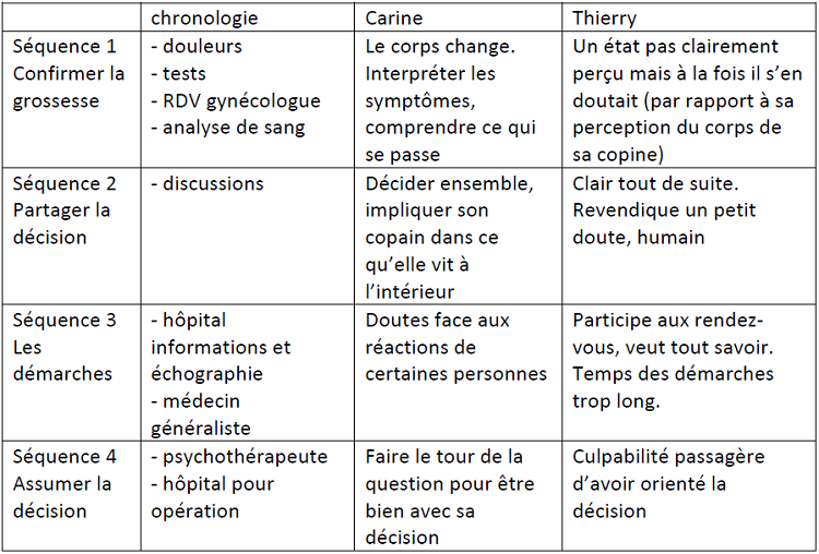 Nous proposons un découpage en 4 séquences de cette situation. Les séquences correspondent à des unités d’action qui font sens et qui se suivent. Dans cette situation, la première séquence correspond à la suspicion d’une grossesse, qu’il s’agit de confirmer. C’est la séquence des tests de grossesse, où les actants cherchent à comprendre ce qui leur arrive. La deuxième séquence est celle de la discussion, en couple. C’est celle où les rationalités des deux actants vont se confronter. La troisième séquence, des démarches pour l’IVG, est celle où Carine fera face à de nouveaux discours, la mettant en porte-à-faux avec sa propre décision. Alors que Thierry, s’il participe activement à la plupart des rendez-vous médicaux, n’en trouve pas moins ce temps trop long, s’habituant presque à « côtoyer un petit être ». La séquence 4 est celle qui présente le moins de points communs pour les actants. Dans cette séquence, Carine rend visite à sa psychothérapeute, ce qui lui permettra d’être plus à l’aise avec sa décision, avant la chirurgie. Une fois l’IVG réalisée, Thierry traverse une petite période de culpabilité vis-à-vis de « l’enfant » « tué » (« ça aurait pu être possible et ça aurait évité d’avoir tué un enfant ») et de Carine. En effet, il est attendri de l’avoir vue en prise avec ses modifications corporelles et ses émotions de la courte période de grossesse. Nous verrons qu’il culpabilise d’avoir orienté la décision.