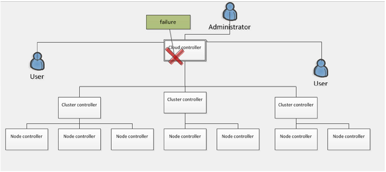 The same problem occurs at any cluster controller where access to the information of this cluster by the cloud controller should become impossible in case of a failure of that cluster controller. One of the solutions to solve this problem is to elect one CC from among the different CCs on the network of which the role will consist in overseeing the current CLC. The same technique should also be applied to each cluster of the system where a node controller should be elected to supervise the actual leader of that cluster. Then, when the cloud controller, eventually, will come to fail, the elected CC node would detect this failure and changes its own state to get in charge of the functions of the lost CLC. Similarly, in each cluster, the elected node controller (NC) will be called to get in charge of the role of its leader when this later node will come to fail.