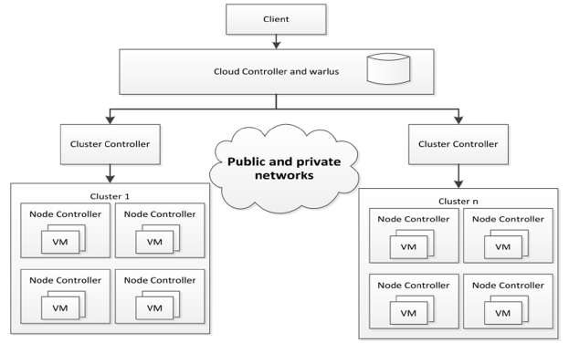 For Infrastructure as a Service private cloud platforms purpose, there are several open-source existing solutions (Eucalyptus, OpenNebula, OpenStack, Nimbus, etc.) which provide the system as common software to deploy and use. A key common point to all these solutions is the centralized monitoring architecture needed to deliver services. Eucalyptus cloud based architecture shows the actual centralization of private cloud system (Figure 1.2). The solution includes three essentials nodes for the monitoring of the services: the cloud controller (CLC), the cluster controller CC and the node controller NC. The CLC is the central node of the architecture. It monitors the system through the different CC on the network. Cluster controllers are the intermediary nodes used by the CLC to collect information over the entire network. Each CC is in charge of a number of node controllers. The role of the different NCs is to monitor the single physical computing node on which they are installed. The other components of the system deal with the management of users’ data and the security concerns. Eucalyptus architecture is seemingly encountered in the other private cloud solutions such as OpenNebula where the save terms namely cluster, node or cloud controller are used. Eucalyptus Architecture