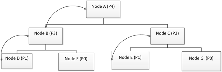 The election scheme proposed in our solution is performed by using five privileges values ranged from 0, 1, 2, 3 to 4. The running process on each physical node on the network should then have five distinct states. A node holding 0 privilege value should act as a simple node controller. Its role will consist in monitoring the single physical node on which it is executed. The privilege 0 state is also the default starting state of all the different nodes. When a node is elected by a CC, it should be affected the value 1 as its privilege value. All the CCs on the network should hold the value 2 of privilege. When a CC is elected by the cloud controller, it should be affected the value 3. The privilege value of the cloud controller should be fixed at 4. At the starting of the system, all the different nodes should hold the value 0 as their default privilege value. Then an initial node should be selected to perform the registering process. This will consist in adding other nodes to the system. Adding a first node to the initial selected node should make its state transit from 0 to 4. The first node added should be affected the value 3. This node will be registered by the CLC as a leader of a new created cluster. From this moment, adding a node as a new cluster leader to the system should result in affecting the value 2 to this node by the actual CLC. Moreover, adding a first node to a cluster, having already a leader, should result in attributing the value 1 to that node. A new node added to a cluster having already a leader and an elected node should result in attributing the value 0 to that node. We use Pi to represent a process holding a privilege i value on a node (Figure 3.1).