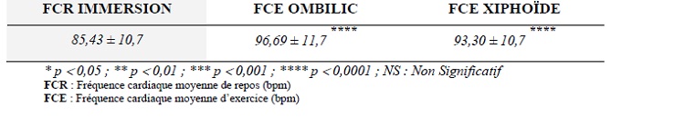Tableau 10. Comparatif des valeurs de FC au repos et à l’exercice lors des tests de marche en immersion
