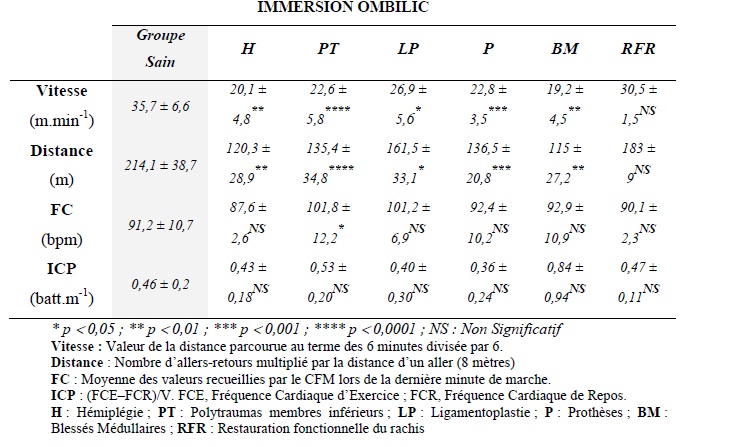 Tableau 14.1. Comparaison entre les performances du groupe sain et les sous groupes pathologies en immersion à l’ombilic. (M ± SD p)