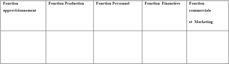 4- Identifier les éléments relatifs aux différentes fonctions de l’entreprise en remplissant le tableau ci-dessous (activités, décisions…).