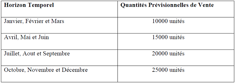 Plein d’optimisme et de confiance dans son projet et inspiré des programmes des ventes de l’entreprise « TIP TOP », Hosni a préparé un programme prévisionnel des ventes de son entreprise sur la base duquel, il va programmer ses niveaux de production.