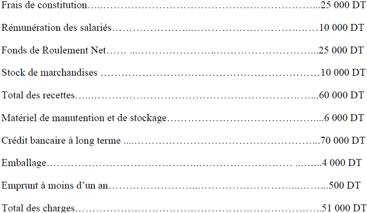 Fatma une jeune styliste modéliste diplômé de l’Institut Supérieur des Métiers de la Mode de Monastir. Après 4 ans d’expérience dans une usine de prêt à porter pour enfants, elle a décidé de lancer son propre projet dans le domaine de la confection d’habillement pour bébé. Sa petite expérience lui a permis d’épargner une somme d’argent qui s’élève à 18.000 dinars qu’elle va l’exploiter pour financer son projet. Son père lui a offert un garage d’une valeur de 12.000 dinars qui va servir comme local pour sa petite entreprise. L’analyse de ses besoins en matériels de confection, montre que son projet nécessite dix machines à coudre, deux tables et fer professionnel pour repassage, quatre ciseaux électriques et une machine pour la pose des oeillets, en total d’un montant de 15.000 dinars. Pour le transport des matières premières et la livraison de ses produits elle aura besoin d’une camionnette, qu’elle estime d’un montant de 17.000 dinars.