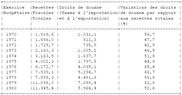 Bref, caractérisée par l’entrée massive des recettes fiscales sur les échanges extérieurs, la période 1970-1980 laisse apparaître une forte dépendance des recettes publiques aux échanges extérieurs, dans ce sens que les pourcentages les plus élevés qui représentent la part des droits de douanes par rapport aux recettes totales, correspondent aux années pendant lesquelles les cours mondiaux du café et les termes de l’échange accusent des indices également élevés.