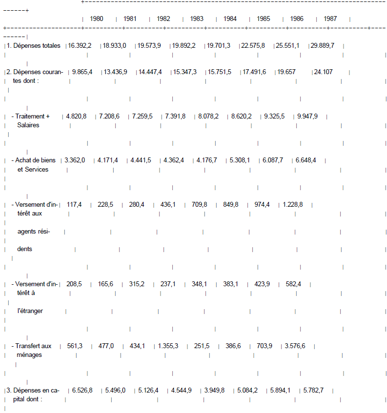 En principe, ce sont les mouvements descendants des recettes publiques et ascendants des dépenses publiques qui sont à la base de l’accentuation du déficit budgétaire jusqu’à la crise financière de 1987 (33). L’analyse qui sera faite dans les lignes qui suivent essayera de retracer en long et en large l’allure de la situation financière pendant la période de crise sans précédent.