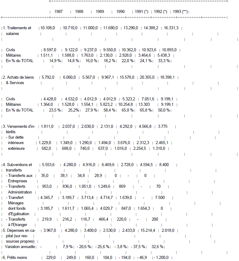 En effet, alors que les dépenses allouées aux traitements et salaires pour les civils affichent une évolution très lente, les salaires des militaires enregistrent un accroissement de 260% entre 1987 et 1993 passant de 1.511 millions à une prévision de 5.438,3 millions de FRW.