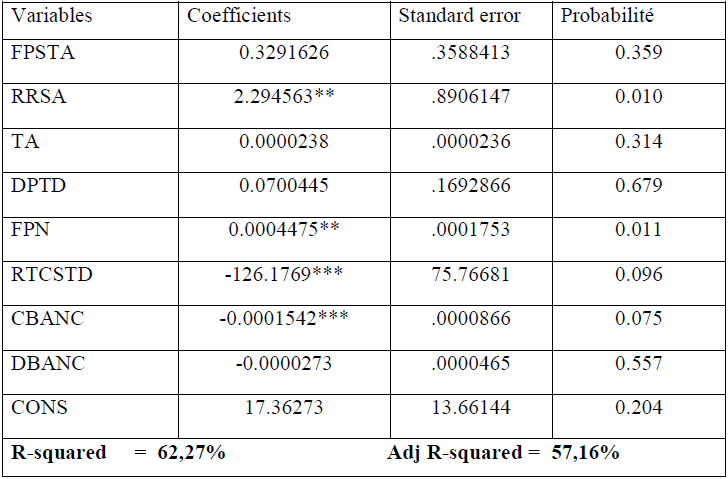 Pour La variable fonds propres net, on constate que les fonds propres net contribuent positivement (+0.0004475) à la rentabilité avec un degré de significativité de 1%. Il en va de même pour la variable FPSTA dont le coefficient (+0.3291626) est positif comme attendu mais non significatif. Pour Raoudha et al,( 2008), les banques bien capitalisées peuvent accéder aux fonds à de meilleures conditions car elles sont considérées comme moins risquées. Plus ce ratio sera élevé, moins la banque est risquée et plus la rentabilité de la banque sera faible.