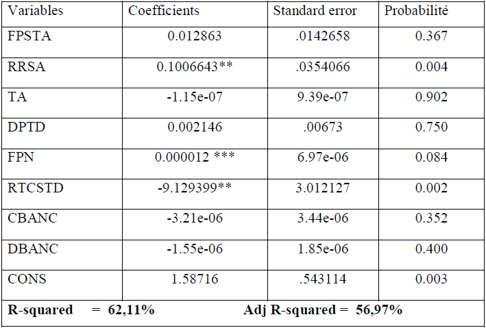 Le coefficient des dépôts bancaires (-1.55e-06) étant contraire au signe attendu et non significatif, cette situation montre tout simplement que la rentabilité bancaire ne dépend pas toujours des dépôts collectés mais plutôt du ratio des réserves liquides sur actif dont le coefficient (+0.1006643) est positif comme attendu et significatif à 1%, des fonds propres net (+0.000012) dont le coefficient est positif comme attendu et significatif à 10%.