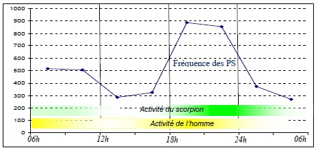 Les piqûres scorpioniques ont lieu de façon prédominante en fin de journée et durant la première partie de la nuit (entre 18 et 24 heures), ceci correspond au maximum d’activité de l’homme et du scorpion comme le montre le schéma ci-dessous (fig. 89). Nos résultats concordent avec les données ontologiques qui font que le scorpion est un animal d’activité nocturne qui quitte son gîte à la tombée de la nuit à la recherche de la nourriture et de l’eau. Nos données sont conformes à celle rapportés par littérature (Goyffon 1982, Champetier 1985, Gueron 1992, Abouihia 1997, Islami 1998, Hamid 1999, Nouira 1999, Bourée 2005, Soulaymani 2002 et 2007, Tamim 2008, Chipaux 2009).