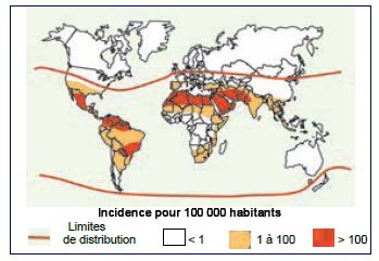 D’après Chippaux (2009), l’incidence est essentiellement limitée à quatre régions fortement endémiques : Mexique, Amérique du Sud à l’Est des Andes, Afrique du Nord dont le Maroc, Proche et Moyen-Orient (fig. 88).