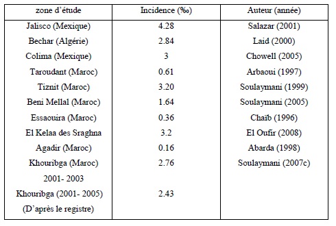 Le taux d’envenimation moyen est de 8.66% au Maroc, avec 8 .1% à Khouribga (2001- 2005) ; il est de 17% en Algérie (Hammoudi 2004) et de 55% au Mexique (Osnaya 2001), ce qui diffère considérablement d’un pays à l’autre.